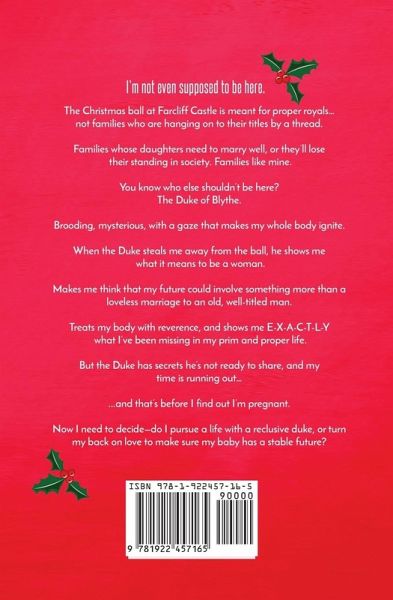 I'm not even supposed to be here. The Christmas Ball at Farcliff Castle is meant for proper royals... not families who are hanging on to their titles by a thread. Families whose daughters need to marry well, else they'll lose their standing in society. Families like mine. You know who else shouldn't be here? The Duke of Blythe. Brooding, mysterious, with a gaze that makes my whole body ignite. When the Duke steals me away from the ball, he shows me what it means to be a woman. Makes me think that my future could involve something more than a loveless marriage to an old, well-titled man. Treats my body with reverence, and shows me E-X-A-C-T-L-Y what I've been missing in my prim and proper life. But the Duke has secrets he's not ready to share, and my time is running out... ...and that's before I find out I'm pregnant. Now I need to decide-do I pursue a life with a reclusive duke, or turn my back on love to make sure my baby has a stable future?