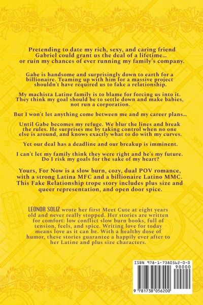 Pretending to date my rich, sexy, and caring friend Gabriel could grant us the deal of a lifetime... or ruin my chances of ever running my family's company. Gabe is handsome and surprisingly down to earth for a billionaire. Teaming up with him for a massive project shouldn't have required us to fake a relationship. My machista Latine family is to blame for forcing us into it. They think my goal should be to settle down and make babies, not run a corporation. But I won't let anything come between me and my career plans... Until Gabe becomes my refuge. We blur the lines and break the rules. He surprises me by taking control when no one else is around, and knows exactly what to do with my curves. Yet our deal has a deadline and our breakup is imminent. I can't let my family think they were right and he's my future. Do I risk my goals for the sake of my heart? Yours, For Now is a slow burn, cozy, dual POV romance, with a strong Latina MFC and a billionaire Latino MMC. This Fake Relationship trope story includes plus size and queer representation, and open door spice.