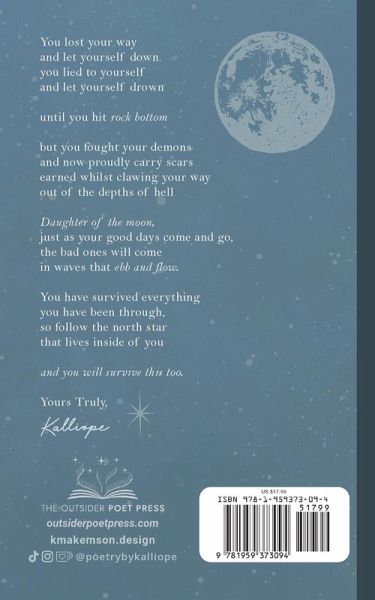 Kalliope Kay's debut book Yours Truly, Kalliope is a collection of poems and prose about navigating the challenges and lessons that come with one's early twenties: loneliness, love, loss, heartbreak, mental illness, trauma, etcetera. Divided into four sections, The Breaking, The Baring, The Becoming, and The Blossoming, this book documents the author's ongoing healing journey through raw and poignant poetry. Life ebbs and flows, and it's okay to not be okay- and it's okay to talk about it. Take what you need, and leave the rest. Designed and Illustrated by Keller Makemson (@kmakemson.design).