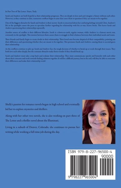 In Part Two of The Letter: Yours, Truly Sarah and Andrew are both hopeful as their relationship progresses. They are deeply in love and can't imagine a future without each other. However, as they continue to date, numerous conflicts begin to arise that cause them to question if they are meant to be together. One of the biggest obstacles for Sarah and Andrew is their secrets. Sarah is concerned about her confusing feelings towards Chris. Andrew's life in the spotlight causes the press to speculate further regarding his relationship with his co-star, Karen Steele. This leaves Sarah and Andrew questioning their relationship repeatedly. Another source of conflict is their different lifestyles. Sarah is a down-to-earth, regular woman, while Andrew is a famous movie star, constantly in the spotlight. This tension between them causes them to struggle to find a balance between their individual needs and wants. Their friends and family begin to create doubt in their relationship. Their loved ones become skeptical of their compatibility, pointing out their differences and questioning whether they are meant to be together. This pressures Sarah and Andrew, causing them to second-guess their relationship. As the conflicts continue to pile up, Sarah and Andrew face the tough decision of whether to break up or work through their issues. They both love each other deeply, but the constant obstacles make them wonder if they should break up. Sarah and Andrew must take a step back and evaluate their relationship. They must communicate openly and honestly with each other about their concerns and work towards finding solutions together. It will be a difficult journey, but in the end, will they be able to overcome their differences and make their relationship work?