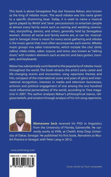 Ndour has substantially contributed to the popularity of mbalax music throughout the world. The book retraces the artist's early career and life-changing events and encounters, song repertoire themes and hits, conquest of the international scene and years of glory and international recognition, interests in media and television businesses, activism and political engagement of one among the one hundred most influential personalities of the world, according to Time magazine in 2007. The author analyzes Ndour's philosophical stance, religious beliefs, and wisdom through analysis of his rich song repertoire.