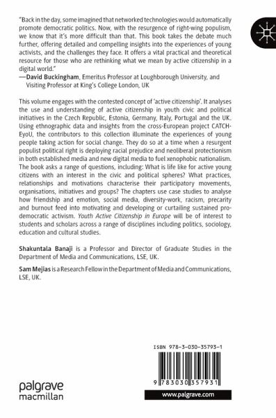 This volume engages with the contested concept of 'active citizenship'. It analyses the use and understanding of active citizenship in youth civic and political initiatives in the Czech Republic, Estonia, Germany, Italy, Portugal and the UK. Using ethnographic data and insights from the cross-European project CATCH-EyoU, the contributors to this collection illuminate the experiences of young people taking action for social change. It does so at a unique moment when a resurgent populist political right is deploying racial prejudice and neoliberal protectionism in both established media and new digital media to fuel xenophobic nationalism. The book asks a range of questions, including: What is life like for active young citizens with an interest in the civic and political spheres? What practices, relationships and motivations characterise their participatory movements, organisations, initiatives and groups? The chapters use casestudies to analyse how friendship and emotion, social media, diversity-work, racism, precarity and burnout feed into motivating and developing or curtailing sustained pro-democratic activism.