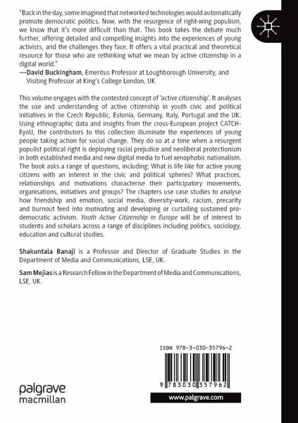 This volume engages with the contested concept of 'active citizenship'. It analyses the use and understanding of active citizenship in youth civic and political initiatives in the Czech Republic, Estonia, Germany, Italy, Portugal and the UK. Using ethnographic data and insights from the cross-European project CATCH-EyoU, the contributors to this collection illuminate the experiences of young people taking action for social change. It does so at a unique moment when a resurgent populist political right is deploying racial prejudice and neoliberal protectionism in both established media and new digital media to fuel xenophobic nationalism. The book asks a range of questions, including: What is life like for active young citizens with an interest in the civic and political spheres? What practices, relationships and motivations characterise their participatory movements, organisations, initiatives and groups? The chapters use casestudies to analyse how friendship and emotion, social media, diversity-work, racism, precarity and burnout feed into motivating and developing or curtailing sustained pro-democratic activism.