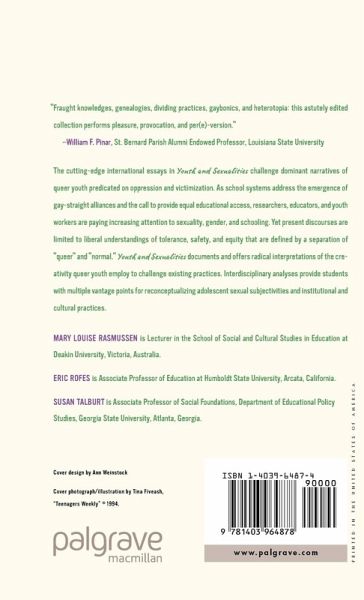 'Every so often new scholarship constitutes a powerful political act. In its analysis of adolescence and naturalized models of gender and sexuality, Youth and Sexualities goes beyond the liberal discourse of identity, tolerance, safety, and equity. The authors of the essays in this volume are skilled at presenting radical critiques of constructs that emphasize oppression and victimization in the lives of GLBTQ youth, even as they take into account their own appreciation for these more popular approaches to civil society.