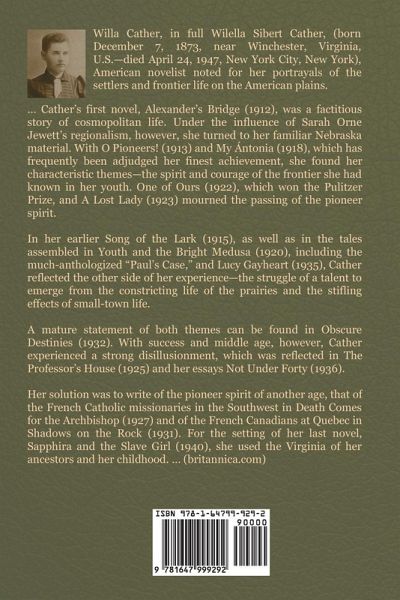 Willa Sibert Cather (December 7, 1873- April 24, 1947) was an American author who achieved recognition for her novels of frontier life on the Great Plains, in works such as O Pioneers!, My Ántonia, and The Song of the Lark. In 1923 she was awarded the Pulitzer Prize for One of Ours (1922), a novel set during World War I. Cather grew up in Nebraska and graduated from the University of Nebraska. She lived and worked in Pittsburgh for ten years, then at age 33 she moved to New York where she lived for the rest of her life. "Youth and the Bright Medusa" is a collection of short stories is by Willa…mehr
