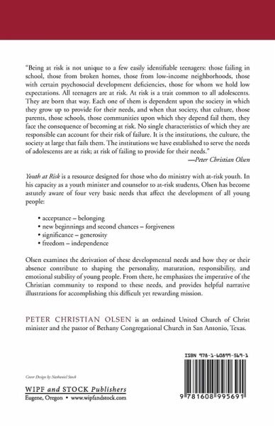 ""Being at risk is not unique to a few easily identifiable teenagers: those failing in school, those from broken homes, those from low-income neighborhoods, those with certain psychosocial development deficiencies, those for whom we hold low expectations. All teenagers are at risk. At risk is a trait common to all adolescents. They are born that way. Each one of them is dependent upon the society in which they grow up to provide for their needs, and when that society, that culture, those parents, those schools, those communities upon which they depend fail them, they face the consequence of becoming at risk. No single characteristics of which they are responsible can account for their risk of failure. It is the institutions, the culture, the society at large that fails them. The institutions we have established to serve the needs of adolescents are at risk; at risk of failing to provide for their needs."" --Peter Christian Olsen Youth at Risk is a resource designed for those who do ministry with at-risk youth. In his capacity as a youth minister and counselor to at-risk students, Olsen has become astutely aware of four very basic needs that affect the development of all young people: - acceptance - belonging - new beginnings and second chances - forgiveness - significance - generosity - freedom - independence Olsen examines the derivation of these developmental needs and how they or their absence contribute to shaping the personality, maturation, responsibility, and emotional stability of young people. From there, he emphasizes the imperative of the Christian community to respond to these needs, and provides helpful narrative illustrations for accomplishing this difficult yet rewarding mission.