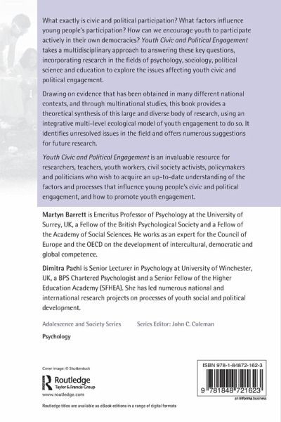 What exactly is civic and political participation? What factors influence young people's participation? How can we encourage youth to participate actively in their own democracies? Youth Civic and Political Engagement takes a multidisciplinary approach to answering these key questions, incorporating research in the fields of psychology, sociology, political science and education to explore the issues affecting youth civic and political engagement. Drawing on evidence that has been obtained in many different national contexts, and through multinational studies, this book provides a theoretical synthesis of this large and diverse body of research, using an integrative multi-level ecological model of youth engagement to do so. It identifies unresolved issues in the field and offers numerous suggestions for future research. Youth Civic and Political Engagement is an invaluable resource for researchers, teachers, youth workers, civil society activists, policymakers and politicians who wish to acquire an up-to-date understanding of the factors and processes that influence young people's civic and political engagement, and how to promote youth engagement.