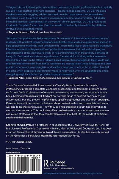 Youth Comprehensive Risk Assessment: A Clinically Tested Approach for Helping Professionals presents a complete youth risk assessment and treatment program based on Dr. Ken Coll's 20 plus years of research on assessing and treating at-risk youth. In this book, helping professionals will find not only a wide range of succinct and easy-to-use assessments, but also proven helpful, highly specific approaches and treatment strategies. Case studies and intervention techniques show professionals-from therapists and social workers to teachers and nurses-how they can help struggling youth find motivation to work on their concerns. This book also offers professionals a menu of assessment surveys and action strategies so that they can develop a plan that best fits the needs of particular youth and their families.