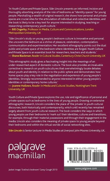 'In Youth Culture and Private Space, Sian Lincoln presents an informed, incisive and thoroughly absorbing analysis of the role of bedrooms as 'identity spaces' for young people. Marshalling a wealth of original research, she shows how personal and private spaces are crucial sites for the articulation of individual and collective identities, and the book is likely to be a key text for anyone interested in studying, teaching or researching contemporary youth culture.'