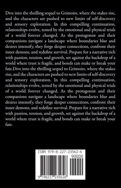 Dive into the thrilling sequel to Grimoire, where the stakes rise, and the characters are pushed to new limits of self-discovery and sensory exploration. In this compelling continuation, relationships evolve, tested by the emotional and physical trials of a world forever changed. As the protagonist and their companions navigate a landscape where boundaries blur and desires intensify, they forge deeper connections, confront their inner demons, and redefine survival. Prepare for a narrative rich with passion, tension, and growth, set against the backdrop of a world where trust is fragile, and bonds can make or break your fate.Dive into the thrilling sequel to Grimoire, where the stakes rise, and the characters are pushed to new limits of self-discovery and sensory exploration. In this compelling continuation, relationships evolve, tested by the emotional and physical trials of a world forever changed. As the protagonist and their companions navigate a landscape where boundaries blur and desires intensify, they forge deeper connections, confront their inner demons, and redefine survival. Prepare for a narrative rich with passion, tension, and growth, set against the backdrop of a world where trust is fragile, and bonds can make or break your fate.