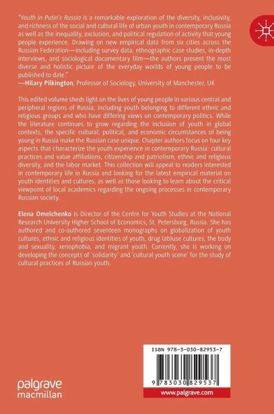 This edited volume sheds light on the lives of young people in various central and peripheral regions of Russia, including youth belonging to different ethnic and religious groups and who have differing views on contemporary politics. While the literature continues to grow regarding the inclusion of youth in global contexts, the specific cultural, political, and economic circumstances of being young in Russia make the Russian case unique. Chapter authors focus on four key aspects that characterize the youth experience in contemporary Russia: cultural practices and value affiliations, citizenship and patriotism, ethnic and religious diversity, and the labor market. This collection will appeal to readers interested in contemporary life in Russia and looking for the latest empirical material on youth identities and cultures, as well as those looking to learn about the critical viewpoint of local academics regarding the ongoing processes in contemporary Russian society.