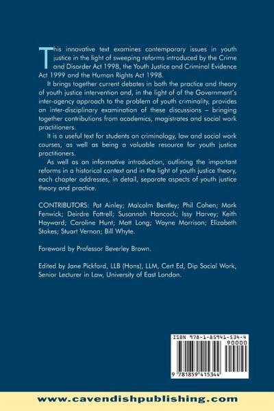 This innovative text examines contemporary issues in youth justice in the light of the sweeping reforms introduced by the Crime and Disorder Act 1998 and the Youth Justice and Criminal Evidence Bill 1999. It brings together current debates in both the practice and theory of youth justice intervention and, in the light of the governments inter-agency approach to the problem of youth criminality, provides an inter-disciplinary examination of these discussions. Including contributions from both academics, magistrates and social work practitioners, it is a useful text for students of criminology, law and social work, as well as a valuable resource for youth justice practitioners.