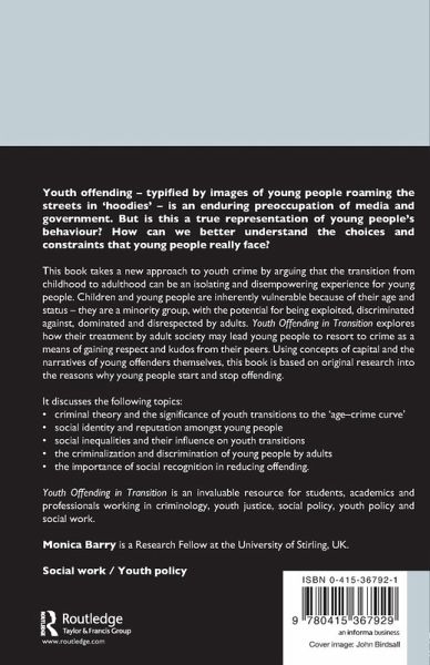 Taking a new approach to youth crime, this book argues that the transition from childhood to adulthood can be an isolating and disempowering experience for young people. Children and young people are inherently vulnerable because of their age and status - they are a minority group, with the potential for being exploited, discriminated against, dominated and disrespected by adults. Youth Offending in Transition explores how their treatment by adult society may lead young people to resort to crime as a means of gaining respect from their peers. Using concepts of capital and the narratives of young offenders themselves, this book is based on original research into the reasons why young people start and stop offending. It discusses the following topics: criminal theory and the significance of youth transitions to the 'age-crime curve' social identity and reputation amongst young people social inequalities and their influence on youth transitions the criminalization and discrimination of young people by adults the importance of social recognition in reducing offending.