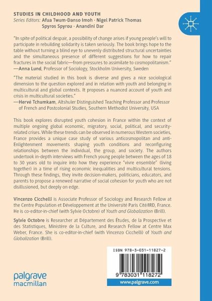 This book explores disrupted youth cohesion in France within the context of multiple ongoing global economic, migratory, social, political, and security-related crises. While these trends can be observed in numerous Western societies, France provides a unique case study of various anti-cosmopolitan and anti-Enlightenment movements shaping youth conditions and reconfiguring relationships between the individual, the group, and society. The authors undertook in-depth interviews with French young people between the ages of 18 to 30 years old to inquire into how they experience "vivre ensemble" (living together) in a time of rising economic inequalities and multicultural tensions. Through these findings, they invite decision-makers, politicians, educators, and parents to propose a renewed narrative of social cohesion for youth who are not disillusioned, but deeply on edge.