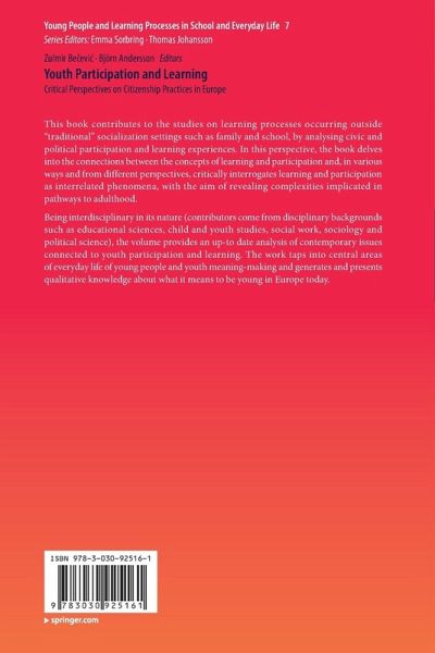 This book contributes to the studies on learning processes occurring outside "traditional" socialization settings such as family and school, by analysing civic and political participation and learning experiences. In this perspective, the book delves into the connections between the concepts of learning and participation and, in various ways and from different perspectives, critically interrogates learning and participation as interrelated phenomena, with the aim of revealing complexities implicated in pathways to adulthood.