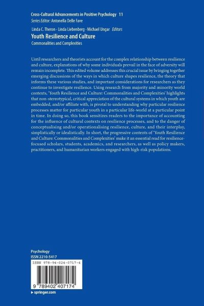 Until researchers and theorists account for the complex relationship between resilience and culture, explanations of why some individuals prevail in the face of adversity will remain incomplete. This edited volume addresses this crucial issue by bringing together emerging discussions of the ways in which culture shapes resilience, the theory that informs these various studies, and important considerations for researchers as they continue to investigate resilience. Using research from majority and minority world contexts, 'Youth Resilience and Culture: Commonalities and Complexities' highlights that non-stereotypical, critical appreciation of the cultural systems in which youth are embedded, and/or affiliate with, is pivotal to understanding why particular resilience processes matter for particular youth in a particular life-world at a particular point in time. In doing so, this book sensitizes readers to the importance of accounting for the influence of cultural contexts on resilience processes, and to the danger of conceptualising and/or operationalising resilience, culture, and their interplay, simplistically or idealistically. In short, the progressive contents of 'Youth Resilience and Culture: Commonalities and Complexities' make it an essential read for resilience-focused scholars, students, academics, and researchers, as well as policy makers, practitioners, and humanitarian workers engaged with high-risk populations.