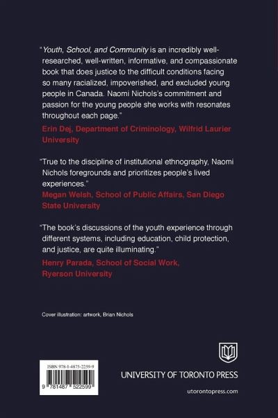 Unlike other books about youth, this book examines how young people’s experiences of inclusion and exclusion are shaped by extended social relations, coordinating thought and conduct across time and space. Working with young people, using a range of participatory institutional ethnographic strategies, this book investigates the social and institutional relations which differentially punctuate our lives. While research began with what young people know and have experienced, this starting place anchors an investigation of public sector institutions and institutional processes that remain implicated in social-historical-economic processes of global capitalism, imperialism, and colonialism. Youth, School, and Community connects the dots between the abstract objectified accounts produced by institutions and enabling institutional action and accounting practices, and the actual material conditions of young people’s lives and development, which these accounts obscure. By focusing on specific policies and procedures that produce young people’s experiences of racialized inclusion/exclusion, safety/risk make it particularly useful to academics, professionals, and activists who want to ensure that young people experience equitable access to public sector resources and not disproportionate exposure to public sector punishments and punitive interventions.