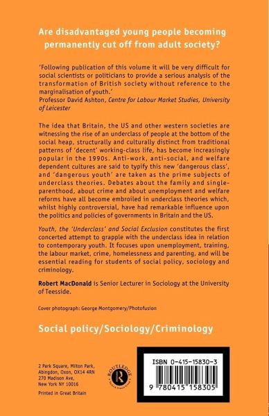 The idea that Britain, the US and other western societies are witnessing the rise of an underclass of people at the bottom of the social heap, structurally and culturally distinct from traditional patterns of `decent' working-class life, has become increasingly popular in the 1990s. Anti-work, anti-social, and welfare dependent cultures are said to typify this new `dangerous class' and `dangerous youth' are taken as the prime subjects of underclass theories. Debates about the family and single-parenthood, about crime and about unemployment and welfare reforms have all become embroiled in underclass theories which, whilst highly controversial, have had remarkable influence on the politics and policies of governments in Britain and the US, Youth, the `Underclass' and Social Exclusion constitutes the first concerted attempt to grapple with the underclass idea in relation to contemporary youth. It focuses upon unemployment, training, the labour market, crime, homelessness, and parenting and will be essential reading for students of social policy, sociology and criminology.