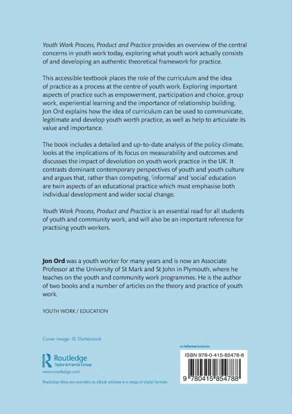 Youth Work Process and Practice provides an overview of the central concerns in youth work today, exploring what youth work actually consists in and developing an authentic theoretical framework for practice. This accessible textbook places the role of the curriculum and idea of practice as a process at the centre of youth work. Exploring important aspects of practice - such as empowerment, participation and choice, group work, experiential learning and the importance of relationship building - Jon Ord explains how the idea of curriculum can be used to communicate, legitimate and develop youth worth practice, as well as help to articulate its value and importance. The book includes a detailed and up-to-date analysis of the policy climate, looks at the implications of its focus on measurability and outcomes and discusses the impact of devolution in the UK on youth work practice. It contrasts dominant contemporary perspectives of youth and youth culture and argues that, rather than competing, 'informal' and 'social' education are twin aspects of an educational practice which must emphasises both individual development and wider social change. Youth Work Process and Practice is an essential read for all students of youth and community work and will also be an important reference for practising youth workers.