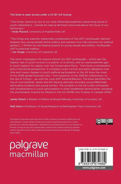 This book investigates the reasons behind the 2017 youthquake - which saw the highest rate of youth turnout in a quarter of a century, and an unprecedented gap in youth support for Labour over the Conservative Party - from both a comparative and a theoretical perspective. It compares youth turnout and party allegiance over time and traces changes in youth political participation in the UK since the onset of the 2008 global financial crisis - from austerity, to the 2016 EU referendum, to the rise of Corbyn - up until the June 2017 General Election. The book identifies the rise of cosmopolitan values and left-leaning attitudes amongst Young Millennials, particularly students and young women. The situation in the UK is also contrasted with developments in youth participation in other established democracies, including the youthquakes inspired by Obama in the US (2008) and Trudeau in Canada (2015).