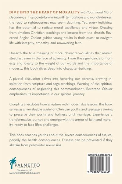 Discover Your Inner Strength: Journey through Morality, Faith, and Virtue in a World of Temptation In a world where temptations loom at every corner and societal pressures challenge our moral compass, Youths and Moral Decadence stands as a beacon of hope for young adults seeking guidance and spiritual fortification. Every young individual has been bestowed with an inherent strength-a moral excellence that can shine even in the face of overwhelming challenges. Reverend Regina Olokor, with her profound insights and years of spiritual guidance, unravels the path to harnessing this inner virtue. Drawing from timeless Christian teachings, lessons from the church, and real-life anecdotes, this book becomes an indispensable companion for those eager to navigate life with unwavering faith and integrity. Discover: ¿The essence of true moral character, qualities that define and distinguish us. ¿The pivotal role of honoring our parents, drawn from age-old scripture and its relevance in our modern world. ¿The transformative power of virtues like empathy, honesty, loyalty, and modesty, and their importance in today's society. ¿The invaluable lessons young adults can imbibe from the church, enriching their moral fiber and making them resilient against worldly distractions. In Youths and Moral Decadence, Reverend Olokor doesn't just preach; she connects, making her teachings resonate with the realities faced by today's Christian youth. This book serves not just as a guide but as a mentor, aiding Christian youths and teenagers in maintaining their purity and holiness until marriage. Dive into this transformative journey and arm yourself with the knowledge, faith, and moral fortitude necessary to thrive in today's challenging world. Whether you're a young adult seeking direction, a parent aiming to guide your child, or simply someone looking for spiritual enrichment, this book promises a renewed understanding of life's true virtues.