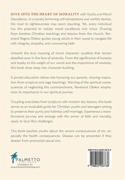 Discover Your Inner Strength: Journey through Morality, Faith, and Virtue in a World of Temptation In a world where temptations loom at every corner and societal pressures challenge our moral compass, Youths and Moral Decadence stands as a beacon of hope for young adults seeking guidance and spiritual fortification. Every young individual has been bestowed with an inherent strength-a moral excellence that can shine even in the face of overwhelming challenges. Reverend Regina Olokor, with her profound insights and years of spiritual guidance, unravels the path to harnessing this inner virtue. Drawing from timeless Christian teachings, lessons from the church, and real-life anecdotes, this book becomes an indispensable companion for those eager to navigate life with unwavering faith and integrity. Discover: ¿The essence of true moral character, qualities that define and distinguish us. ¿The pivotal role of honoring our parents, drawn from age-old scripture and its relevance in our modern world. ¿The transformative power of virtues like empathy, honesty, loyalty, and modesty, and their importance in today's society. ¿The invaluable lessons young adults can imbibe from the church, enriching their moral fiber and making them resilient against worldly distractions. In Youths and Moral Decadence, Reverend Olokor doesn't just preach; she connects, making her teachings resonate with the realities faced by today's Christian youth. This book serves not just as a guide but as a mentor, aiding Christian youths and teenagers in maintaining their purity and holiness until marriage. Dive into this transformative journey and arm yourself with the knowledge, faith, and moral fortitude necessary to thrive in today's challenging world. Whether you're a young adult seeking direction, a parent aiming to guide your child, or simply someone looking for spiritual enrichment, this book promises a renewed understanding of life's true virtues.