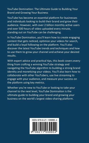 YouTube Domination: The Ultimate Guide to Building Your Brand and Growing Your Business YouTube has become an essential platform for businesses and individuals looking to build their brand and grow their audience. However, with over 2 billion monthly active users and over 500 hours of video uploaded every minute, standing out on YouTube can be challenging. In YouTube Domination, you'll learn how to create engaging content that gets noticed, optimize your videos for search, and build a loyal following on the platform. You'll also discover the latest YouTube trends and techniques and how to use them to grow your channel and achieve your desired results. With expert advice and practical tips, this book covers everything from crafting a winning YouTube strategy and navigating the YouTube algorithm to building a strong brand identity and monetizing your videos. You'll also learn how to collaborate with other YouTubers, use live streaming to engage with your audience, and measure your success on the platform using key metrics. Whether you're new to YouTube or looking to take your channel to the next level, YouTube Domination is the ultimate guide to building your brand and growing your business on the world's largest video-sharing platform.