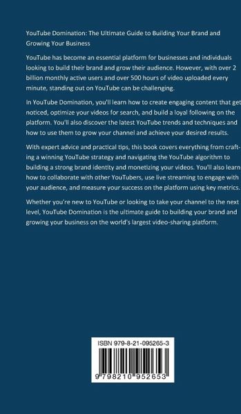 YouTube Domination: The Ultimate Guide to Building Your Brand and Growing Your Business YouTube has become an essential platform for businesses and individuals looking to build their brand and grow their audience. However, with over 2 billion monthly active users and over 500 hours of video uploaded every minute, standing out on YouTube can be challenging. In YouTube Domination, you'll learn how to create engaging content that gets noticed, optimize your videos for search, and build a loyal following on the platform. You'll also discover the latest YouTube trends and techniques and how to use them to grow your channel and achieve your desired results. With expert advice and practical tips, this book covers everything from crafting a winning YouTube strategy and navigating the YouTube algorithm to building a strong brand identity and monetizing your videos. You'll also learn how to collaborate with other YouTubers, use live streaming to engage with your audience, and measure your success on the platform using key metrics. Whether you're new to YouTube or looking to take your channel to the next level, YouTube Domination is the ultimate guide to building your brand and growing your business on the world's largest video-sharing platform.