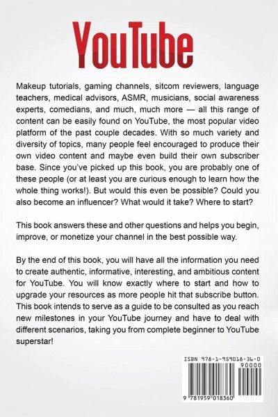 YOUTUBE Makeup tutorials, gaming channels, sitcom reviewers, language teachers, medical advisors, ASMR, musicians, social awareness experts, comedians, and much, much more - all this range of content can be easily found on YouTube, the most popular video platform of the past couple decades. With so much variety and diversity of topics, many people feel encouraged to produce their own video content and maybe even build their own subscriber base. Since you've picked up this book, you are probably one of these people (or at least you are curious enough to learn how the whole thing works!). But would this even be possible? Could you also become an influencer? What would it take? Where to start? This book answers these and other questions and helps you begin, improve, or monetize your channel in the best possible way. By the end of this book, you will have all the information you need to create authentic, informative, interesting, and ambitious content for YouTube. You will know exactly where to start and how to upgrade your resources as more people hit that subscribe button. This book intends to serve as a guide to be consulted as you reach new milestones in your YouTube journey and have to deal with different scenarios, taking you from complete beginner to YouTube superstar! So, what are you waiting for? Scroll up and hit "Buy Now' to seriously level up your YouTube game today!
