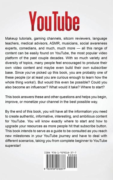 YOUTUBE Makeup tutorials, gaming channels, sitcom reviewers, language teachers, medical advisors, ASMR, musicians, social awareness experts, comedians, and much, much more - all this range of content can be easily found on YouTube, the most popular video platform of the past couple decades. With so much variety and diversity of topics, many people feel encouraged to produce their own video content and maybe even build their own subscriber base. Since you've picked up this book, you are probably one of these people (or at least you are curious enough to learn how the whole thing works!). But would this even be possible? Could you also become an influencer? What would it take? Where to start? This book answers these and other questions and helps you begin, improve, or monetize your channel in the best possible way. By the end of this book, you will have all the information you need to create authentic, informative, interesting, and ambitious content for YouTube. You will know exactly where to start and how to upgrade your resources as more people hit that subscribe button. This book intends to serve as a guide to be consulted as you reach new milestones in your YouTube journey and have to deal with different scenarios, taking you from complete beginner to YouTube superstar! So, what are you waiting for? Scroll up and hit "Buy Now' to seriously level up your YouTube game today!