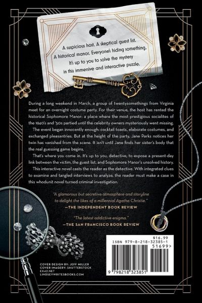"The latest addictive enigma." - The San Francisco Book Review¿¿¿¿ "A glamorous but secretive atmosphere and storyline to delight the likes of a millennial Agatha Christie." - The Independent Book Review During a long weekend in March, a group of twentysomethings from Virginia meet for an overnight costume party. For their venue, the host has rented the historical Sophomore Manor: a place where the most prestigious socialites of the 1940's and '50s partied until the celebrity owners mysteriously went missing. The event began innocently enough: cocktail toasts, elaborate costumes, and exchanged pleasantries. But at the height of the party, Jane Parks notices her twin has vanished from the scene. It isn't until Jane finds her sister's body that the real guessing game begins. That's where you come in. It's up to you, detective, to expose a present-day link between the victim, the guest list, and Sophomore Manor's unsolved history. This interactive novel casts the reader as the detective. With integrated clues to examine and entangled interviews to analyze, the reader must make a case in this whodunit novel turned criminal investigation.