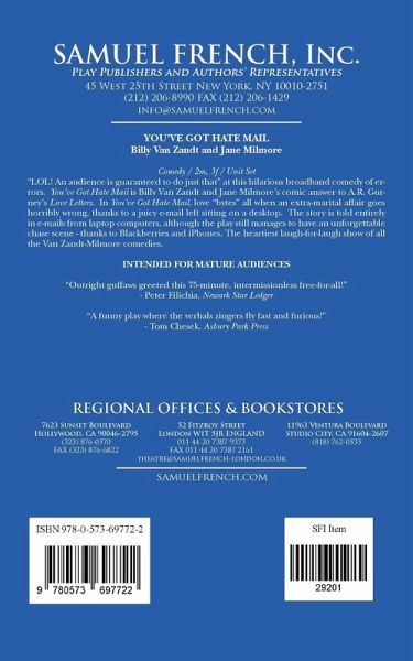 Comedy / Characters: 2m, 3f / Unit Set "LOL! An audience is guaranteed to do just that" at this hilarious broadband comedy of errors. You've Got Hate Mail is Billy Van Zandt and Jane Milmore's comic answer to A.R. Gurney's Love Letters. In You've Got Hate Mail, love "bytes" all when an extra-marital affair goes horribly wrong, thanks to a juicy e-mail left sitting on a desktop. The story is told entirely in e-mails from laptop computers, although the play still manages to have an unforgettable