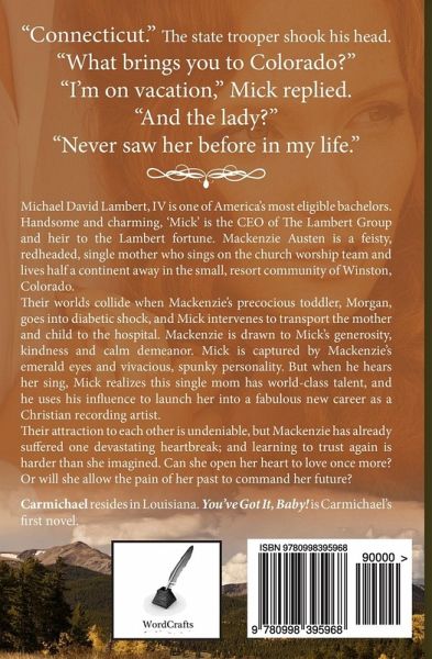 "Connecticut." The state trooper shook his head. "What brings you to Colorado?" "I'm on vacation," Mick replied. "And the lady?" "Never saw her before in my life." Michael David Lambert, IV is one of America's most eligible bachelors. Handsome and charming, 'Mick' is the CEO of The Lambert Group and heir to the Lambert fortune. Mackenzie Austen is a feisty, redheaded, single mother who sings on the church worship team and lives half a continent away in the small, resort community of Winston, Colorado. Their worlds collide when Mackenzie's precocious toddler, Morgan, goes into diabetic shock, and Mick intervenes to transport the mother and child to the hospital. Mackenzie is drawn to Mick's generosity, kindness and calm demeanor. Mick is captured by Mackenzie's emerald eyes and vivacious, spunky personality. But when he hears her sing, Mick realizes this single mom has world-class talent, and he uses his influence to launch her into a fabulous new career as a Christian recording artist. Their attraction to each other is undeniable, but Mackenzie has already suffered one devastating heartbreak; and learning to trust again is harder than she imagined. Can she open her heart to love once more? Or will she allow the pain of her past to command her future?