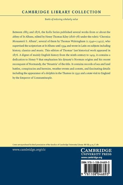 Between 1863 and 1876, the Rolls Series published several works from or about the abbey of St Albans, edited by Henry Thomas Riley (1816-78) under the rubric 'Chronica Monasterii S. Albani', several of them by Thomas Walsingham (c.1340-c.1422), who supervised the scriptorium at St Albans until 1394 and wrote in Latin on subjects including history, classics and music. This edition of Thomas' last historical work appeared in 1876. A digest of mainly English history from the ninth century to 1419, it contains a dedication to Henry V that emphasises his dynasty's Norman origins and his recent reconquest of Normandy, the 'Neustria' of the title. It contains records of sea and land battles, conspiracies and heresies, weather events and comets, and fascinating details including the appearance of a dolphin in the Thames in 1392 and a state visit to England by the Emperor of Constantinople.