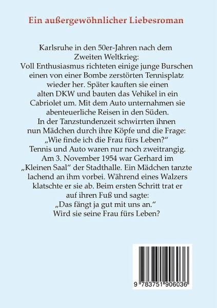 Karlsruhe in den 50er-Jahren nach dem Zweiten Weltkrieg:Voll Enthusiasmus richteten einige junge Burschen einen von einer Bombe zerstörten Tennisplatz wieder her. Damals gab es kein Handy, kein I-Phone, keinen PC, selbst Telefonanschlüsse waren eine Seltenheit. Und Fernsehen existierte auch noch nicht. Trotzdem erlebten die jungen Leute eine glückliche Jugendzeit, die der Roman aus der Perspektive von Gerhard erzählt. Später kauften die jungen Männer einen alten DKW und bauten das Vehikel in ein Cabriolet um. Mit dem Auto, ihrem "Atomkarle", unternahmen sie abenteuerliche Reisen in den Süden: In die Schweiz über den Gotthardpass, den Autotunnel gab es noch nicht, nach Italien und Österreich. In der Tanzstundenzeit schwirrten ihnen nun Mädchen durch ihre Köpfe und die Frage, wie man die richtige Frau fürs Leben findet. Tennis und Auto waren nur noch zweitrangig. Am 3. November 1954 war Gerhard im Kleinen Saal der Stadthalle. Ein Mädchen tanzte lachend an ihm vorbei. Während eines Walzers klatschte er sie ab. Beim ersten Schritt trat er auf ihren Fuß. Wird sie seine Frau fürs Leben? Ein außergewöhnlicher Liebesroman mit poetischen Liebesbriefen, der die Leser in die Zeit der 50er-Jahre mitnimmt.