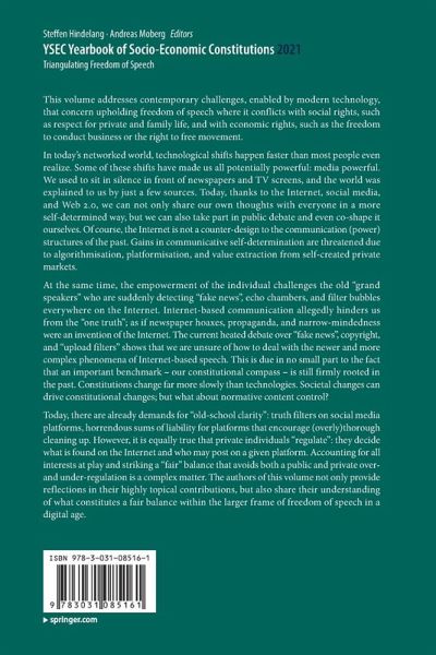 This volume addresses contemporary challenges, enabled by modern technology, that concern upholding freedom of speech where it conflicts with social rights, such as respect for private and family life, and with economic rights, such as the freedom to conduct business or the right to free movement.