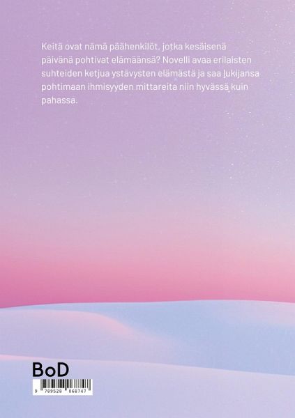 Keitä ovat nämä päähenkilöt, jotka kesäisenä päivänä pohtivat elämäänsä? Novelli avaa erilaisten suhteiden ketjua ystävysten elämästä ja saa lukijansa pohtimaan ihmisyyden mittareita niin hyvässä kuin pahassa.