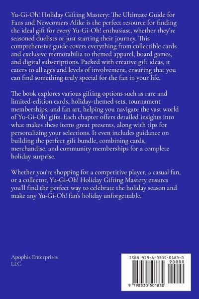 Yu-Gi-Oh! Holiday Gifting Mastery: The Ultimate Guide for Fans and Newcomers Alike is the perfect resource for finding the ideal gift for every Yu-Gi-Oh! enthusiast, whether they're seasoned duelists or just starting their journey. This comprehensive guide covers everything from collectible cards and exclusive memorabilia to themed apparel, board games, and digital subscriptions. Packed with creative gift ideas, it caters to all ages and levels of involvement, ensuring that you can find something truly special for the fan in your life. The book explores various gifting options such as rare and limited-edition cards, holiday-themed sets, tournament memberships, and fan art, helping you navigate the vast world of Yu-Gi-Oh! gifts. Each chapter offers detailed insights into what makes these items great presents, along with tips for personalizing your selections. It even includes guidance on building the perfect gift bundle, combining cards, merchandise, and community memberships for a complete holiday surprise. Whether you're shopping for a competitive player, a casual fan, or a collector, Yu-Gi-Oh! Holiday Gifting Mastery ensures you'll find the perfect way to celebrate the holiday season and make any Yu-Gi-Oh! fan's holiday unforgettable.