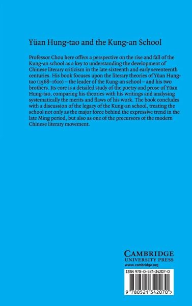 Professor Chou here offers a perspective on the rise and fall of the Kung-an school as a key to understanding the development of Chinese literary criticism in the late sixteenth and early seventeenth centuries. His book focuses upon the literary theories of Yüan Hung-tao (1568-1610) - the leader of the Kung-an school - and his two brothers. Its core is a detailed study of the poetry and prose of Yüan Hung-tao, comparing his theories with his writings and analysing systematically the merits and flaws of his work. The book concludes with a discussion of the legacy of the Kung-an school, treating the school not only as the major force behind the expressive trend in the late Ming period, but also as one of the precursors of the modern Chinese literary movement.