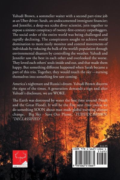 Yuhudi Brown, a sommelier waiter with a second part-time job as an Uber driver; Sarah, an undocumented immigrant financier; and Jennifer, a deep-sea scuba diver scientist, join together to expose a sinister conspiracy of twenty-first-century carpetbaggers. The social order of the entire world was being challenged and rapidly declining. The conspirators sought to achieve world domination to more easily monitor and control movements of individuals by reducing the bulk of the worlds population through environmental disasters by controlling the weather. Yuhudi and Jennifer saw the best in each other and overlooked the worse. They loved each others souls inside and out, and that made them happy. But something different happened when Sarah became a part of this trio. Together, they would touch the sky turning themselves into something few saw coming. America's nightmare and Russia's dream. Yuhudi Brown discerns the signs of the times. A generation demands a sign and after Yuhudi's disclosure, we are WOKE. The Earth was destroyed by water the first time around (Noah and the Great Flood). It will be the Fire next time unless we do something SOON about man made global warming climate change. Big Sky - Save Our Planet. YUHUDI BROWN, "DECLASSIFIED".
