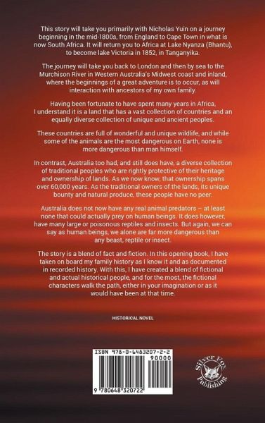 This story will take you primarily with Nicholas Yuin on a journey beginning in the mid-1800s, from England to Cape Town in what is now South Africa. It will return you to Africa at Lake Nyanza (Bhantu), to become lake Victoria in 1852, in Tanganyika. The journey will take you back to London and then by sea to the Murchison River in Western Australia’s Midwest coast and inland, where the beginnings of a great adventure is to occur, as will interaction with ancestors of my own family. Having been fortunate to have spent many years in Africa, I understand it is a land that has a vast collection of countries and an equally diverse collection of unique and ancient peoples. These countries are full of wonderful and unique wildlife, and while some of the animals are the most dangerous on Earth, none is more dangerous than man himself. In contrast, Australia too had, and still does have, a diverse collection of traditional peoples who are rightly protective of their heritage and ownership of lands. As we now know, that ownership spans over 60,000 years. As the traditional owners of the lands, its unique bounty and natural produce, these people have no peer. Australia does not now have any real animal predators – at least none that could actually prey on human beings. It does however, have many large or poisonous reptiles and insects. But again, we can say as human beings, we alone are far more dangerous than any beast, reptile or insect. The story is a blend of fact and fiction. In this opening book, I have taken on board my family history as I know it and as documented in recorded history. With this, I have created a blend of fictional and actual historical people, and for the most, the fictional characters walk the path, either in your imagination or as it would have been at that time.