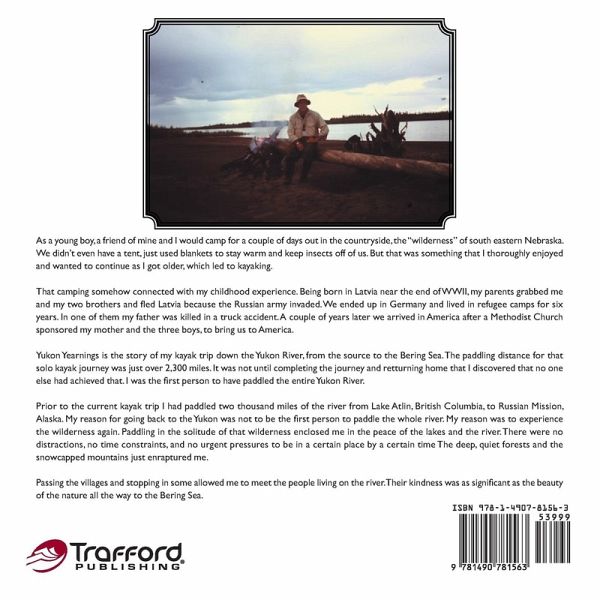 Yukon Yearnings is the story of my kayak trip down the Yukon River, from the source to the Bering Sea. The paddling distance for that solo kayak journey was just over 2,300 miles. It was not until completing the journey and retturning home that I discovered that no one else had achieved that. I was the first person to have paddled the entire Yukon River. Prior to the current kayak trip I had paddled two thousand miles of the river from Lake Atlin, British Columbia, to Russian Mission, Alaska. My reason for going back to the Yukon was not to be the first person to paddle the whole river. My reason was to experience the wilderness again. Paddling in the solitude of that wilderness enclosed me in the peace of the lakes and the river. There were no distractions, no time constraints, and no urgent pressures to be in a certain place by a certain time The deep, quiet forests and the snowcapped mountains just enraptured me. Passing the villages and stopping in some allowed me to meet the people living on the river. Their kindness was as significant as the beauty of the nature all the way to the Bering Sea.
