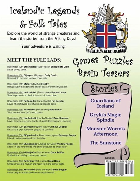 Updated 2nd edition includes more coloring pages! This 41-page coloring book features all thirteen of the Icelandic Yule Lads plus additional characters from Icelandic folklore. Book includes puzzles, games, activities and four short stories. Bonus stories are based on Icelandic mythology and legendary characters passed down from the days of the Vikings. Stories include The Guardians of Iceland, Gryla's Magic Spindle, The Monster Worm's Afternoon, and The Sunstone. The Sunstone introduces Tassi, the resident mouse who lives on the Viking Agnarr's longboat and accompanies him on his adventures.
