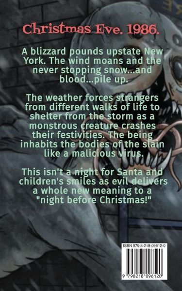 Christmas Eve. 1986. A blizzard pounds upstate New York. The wind moans and the never stopping snow...and blood...pile up. The weather forces strangers from different walks of life to shelter from the storm as a monstrous creature crashes their festivities. The being inhabits the bodies of the slain like a malicious virus. This isn't a night for Santa and children's smiles as evil delivers a whole new meaning to a "night before Christmas!"
