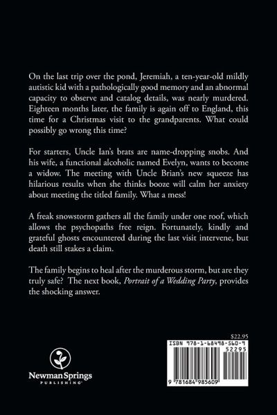 On the last trip over the pond, Jeremiah, a ten-year-old mildly autistic kid with a pathologically good memory and an abnormal capacity to observe and catalog details, was nearly murdered. Eighteen months later, the family is again off to England, this time for a Christmas visit to the grandparents. What could possibly go wrong this time? For starters, Uncle Ian's brats are name-dropping snobs. And his wife, a functional alcoholic named Evelyn, wants to become a widow. The meeting with Uncle Brian's new squeeze has hilarious results when she thinks booze will calm her anxiety about meeting the titled family. What a mess! A freak snowstorm gathers all the family under one roof, which allows the psychopaths free reign. Fortunately, kindly and grateful ghosts encountered during the last visit intervene, but death still stakes a claim. The family begins to heal after the murderous storm, but are they truly safe? The next book, Portrait of a Wedding Party, provides the shocking answer.