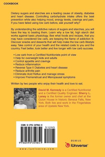 Dietary sugars and starches are a leading cause of obesity, diabetes and heart disease. Controlling carbohydrate intake offers the best prevention while also helping mood, energy levels, cravings and pain. If you have failed using low carb before, ask yourself why? By understanding the addictive nature of sugars and starches, you will have the key to beating them. Learn why a low fat, high starch diet works against basic physiology. See what foods and recipes, that you may have considered low carb, are keeping the flame of addiction lit. Discover snacks and desserts that will help make the low carb lifestyle easy. Take control of your health and the related costs to you and the country. Feel better, look better and live longer with low carb success. · Low carb from a Certified Nutritionists point of view · Help for overweight kids and adults · Control appetite and cravings · Reduce inflammation · Reverse Type II Diabetes and heart disease · Reduce arthritis pain · Eliminate Acid Reflux and manage stress · Improve Premenstrual and Menopausal symptoms Written by two people who enjoy their health and love to eat.