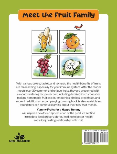 Everyone loves to snack, but not everyone knows that snacks can be healthy. Nutritious and delicious choices exist. As children are more apt to gravitate towards sugary treats, this book, aimed at a younger readership, will show them that better options are available. Meet the Fruit Family. Fruits are edible parts of plants and trees. With various colors, tastes, and textures, the health benefits of fruits are far-reaching, especially for your immune system. Within this clever and informative book, readers will learn which particular fruit is helpful to each specific part or system of the body, such as heart health, cancer prevention, digestion, brain function, and more. Each fruit introduces itself in a first-person narrative, grouped into categories based on color. Readers will discover new facts about widely recognized fruits, such as cantaloupe, grapes, and apples. They will also become acquainted with fruits that may be new to them, such as atemoya, cherimoya, and soursop, from South America. The fruits describe their texture, what vitamins they offer, where they can be found, and which body parts they support. After meeting more than 30 common and unique fruits, readers are presented with a mouth-watering recipe section, including detailed instructions for making fruit salads, smoothies, shakes, breakfasts, and more. This fun, unique, and easily digestible book invites readers to get to know the large and varied Fruit Family. In addition, an accompanying coloring book is also available so youngsters can continue learning about their new fruit friends. Yummy Fruits for a Happy Tummy will inspire a newfound appreciation of the produce section in readers' local grocery stores, leading to a long-lasting relationship with fruit and better health.