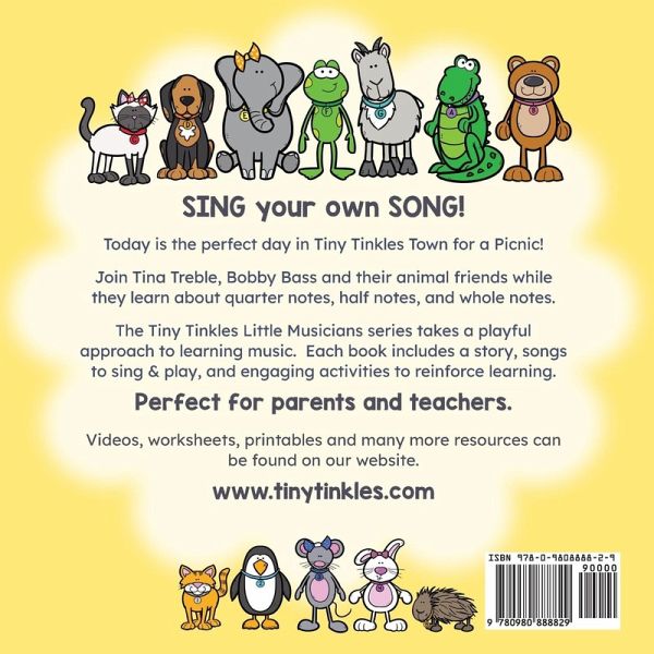 A Storybook approach to learning Music, perfect for ages 3-7. Today is the perfect day in Tiny Tinkles Town for a Picnic! Join Tina Treble, Bobby Bass and their musical friends while they learn about quarter notes, half notes, and whole notes. Join Tina Treble, Bobby Bass and their musical friends for a picnic and learn about quarter notes, half notes, and whole notes. A Colorful and engaging music teaching book! Yummy In My Tummy introduces beginning music literacy skills. Creatively teaching young children how Rhythm in Music FEELS. The Animals make this story come alive! In this book, we explore the piano keyboard, and feature the notes of the musical alphabet. Musical concepts are taught through repetition, call and response using predictable patterns, and encouraging learning through improvisation. This series offers endless opportunities for speech development and vocal exploration. Musical Experience is NOT Necessary! Perfect for Parents, Teachers and their little musicians. Free Resources Included! The last two pages of the printed books contain activity cards that can be cut out and laminated. Instructions to play numerous games to reinforce the concepts introduced in this book. How to Videos, FREE Printable Worksheets and Music for all of the songs inside the book can be found on our website www.tinytinkles.com