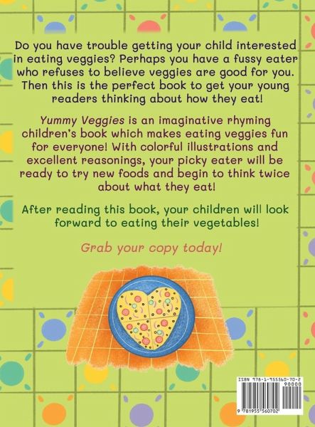 Do you have trouble getting your child interested in eating veggies? Perhaps you have a fussy eater who refuses to believe veggies are good for you. Then this is the perfect book to get your young readers thinking about how they eat! Yummy Veggies is an imaginative rhyming children's book which makes eating veggies fun for everyone! With colorful illustrations and excellent reasonings, your picky eater will be ready to try new foods and begin to think twice about what they eat! After reading this book, your children will look forward to eating their vegetables!