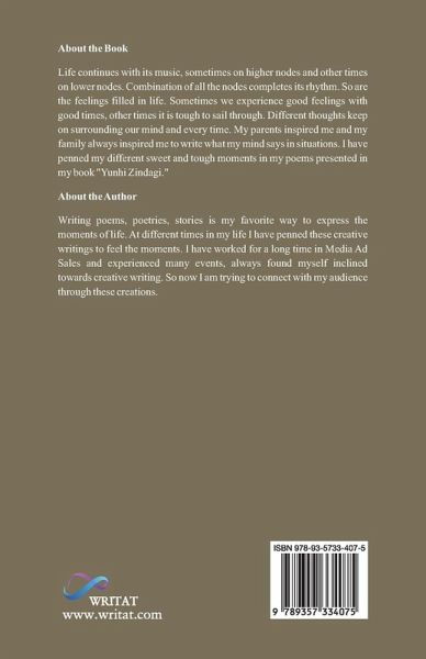 Life continues with its music, sometimes on higher nodes and other times on lower nodes. Combination of all the nodes completes its rhythm. So are the feelings filled in life. Sometimes we experience good feelings with good times, other times it is tough to sail through. Different thoughts keep on surrounding our mind and every time. My parents inspired me and my family always inspired me to write what my mind says in situations. I have penned my different sweet and tough moments in my poems presented in my book "Yunhi Zindagi."